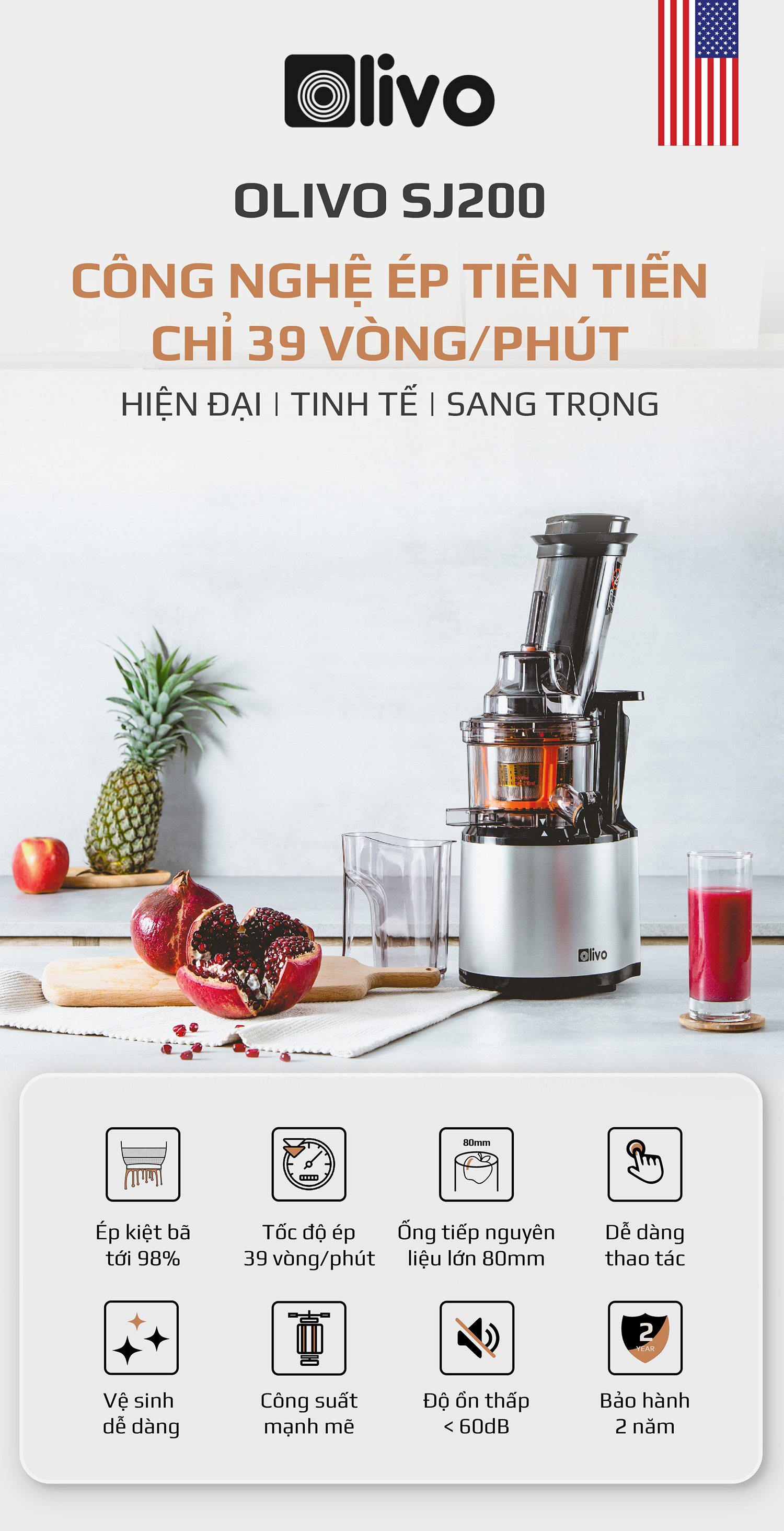 – OLIVO SJ200 là dòng máy ép công nghệ mới từ Mỹ có khả năng ép kiệt đến 98% cùng thiết kế trang nhã, sang trọng hứa hẹn sẽ là một “thành viên” không thể thiếu trong gian bếp mỗi gia đình.