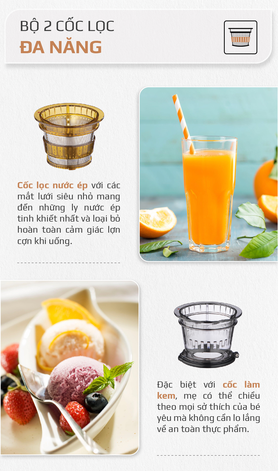 – 2 chế độ lọc riêng biệt: Cốc lọc nước ép, cốc làm kem cho phép người dùng linh hoạt thay đổi chế độ lọc phù hợp nhất với nhu cầu sử dụng. Bạn có thể thoải mái sáng tạo những thức uống, đồ ăn ngon lành, tươi mát từ rau củ, hoa quả trong tích tắc mà không lo bị nhàm chán.