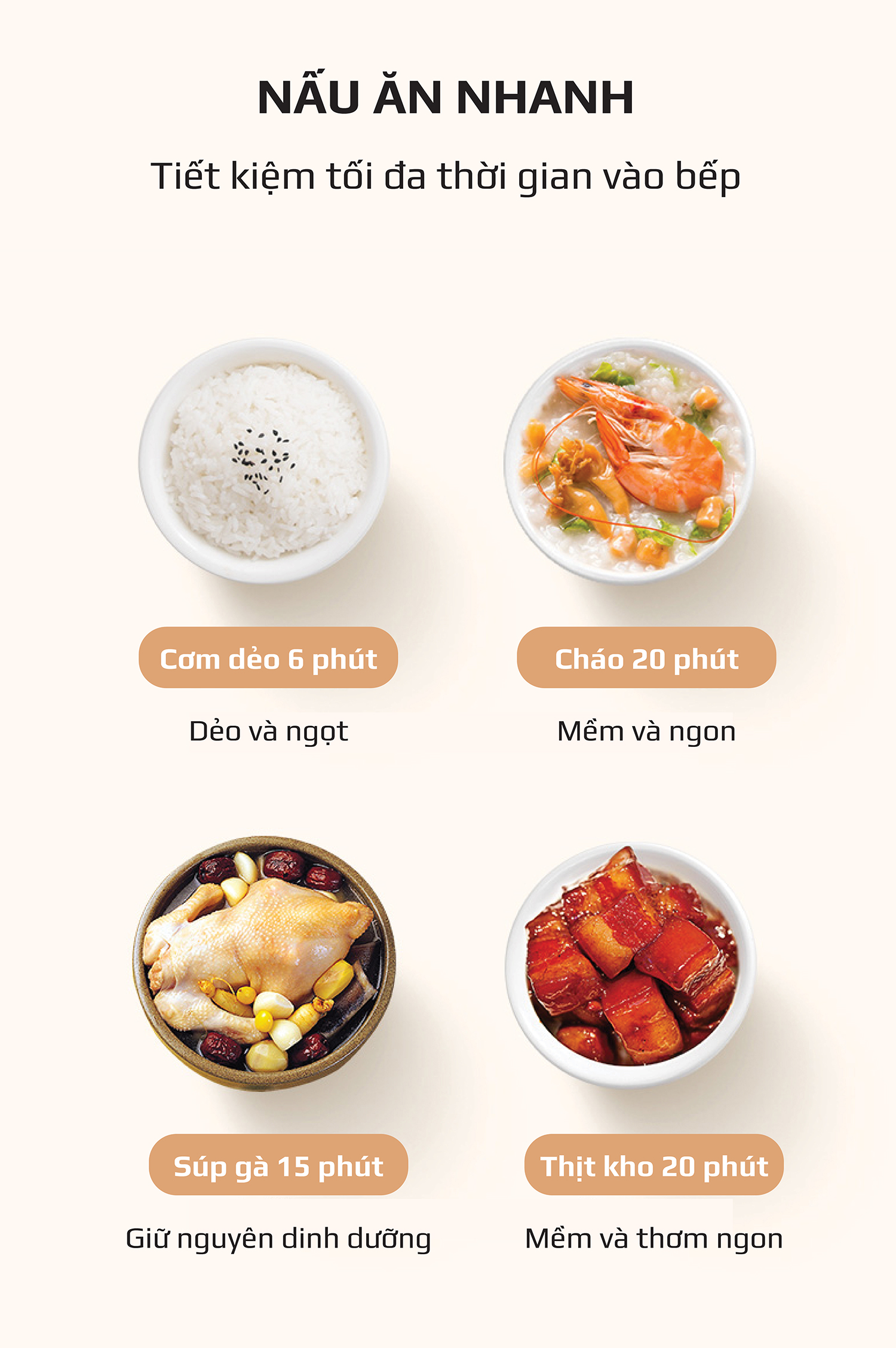 🥩 Thịt | 🍗 Gia cầm | 🥣 Súp | 🫘 Các loại đậu | 🍚 Gạo trắng | 🌾 Gạo lứt | 🌰 Ngũ cốc | 🥕 Hầm rau củ | ⏳ Nấu chậm | 🥛 Sữa chua | 🔥 Đun sôi | 🥔 Hầm khoai tây | 🍲 Lẩu | 🍳 Xào | 🍖 Xương | 🔥 Hâm nóng